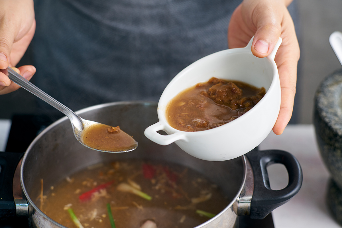 ตั้งเตาต้มน้ำสต๊อกไก่จนพอเดือด แล้วจึงใส่เครื่องพริกแกงที่เตรียมไว้ลงไป