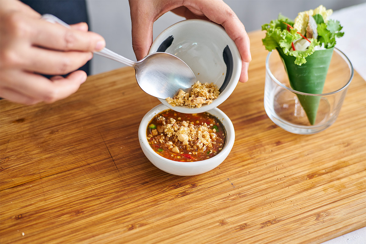 ทำน้ำยำซอสถั่ว โดยใส่น้ำปลา น้ำตาลโตนด และน้ำมะนาว คนให้เข้ากันจนน้ำตาลโตนดละลาย แล้วจึงใส่พริกและถั่วลิสงตามลงไป
