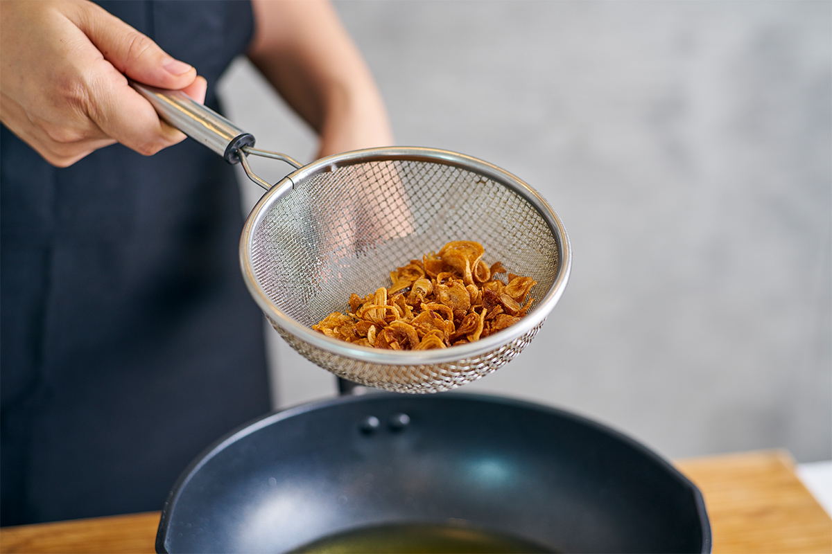 นำสมุนไพรทั้งหมดเจียวในน้ำมัน และ นำขึ้นพักให้สะเด็ดน้ำมัน
